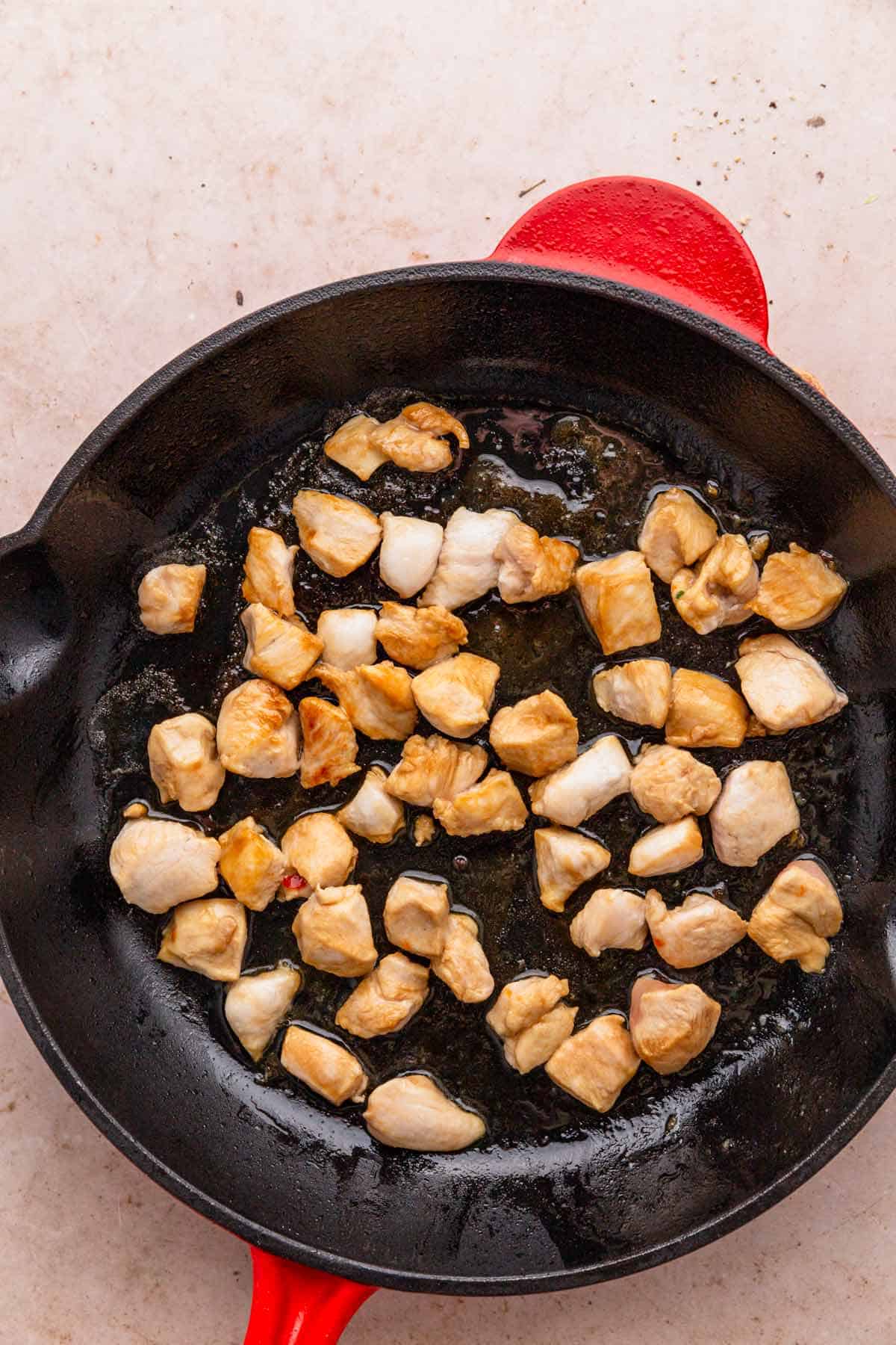 - Chicken - cut into small pieces, and cook in a skillet or wok. You can also use chicken thighs or tender or other proteins.