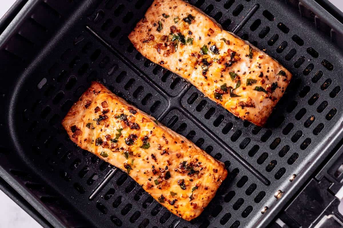 - Space the salmon filets out in the air fryer basket, so they are not overcrowded. Proper circulation of hot air will ensure an even cook on all sides. You could also turn the filets over mid-cook, although it’s optional.