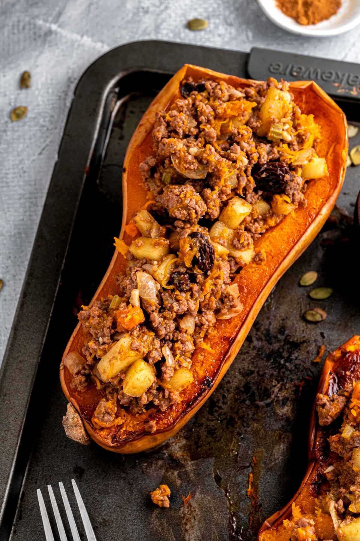 enjoy delicious stuffed butternut squash with ground meat, apples and raisins! Perfect all in one dinner!