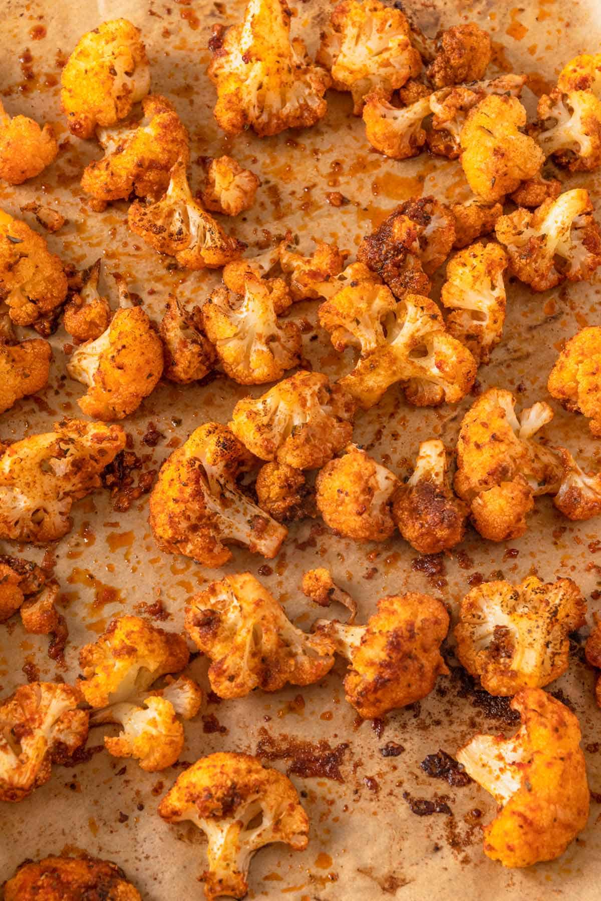 - Arrange the seasoned cauliflower florets in a single layer on a baking sheet lined with parchment paper or aluminum foil. Keep an inch or two in between florets (important as it helps them to crisp up better).