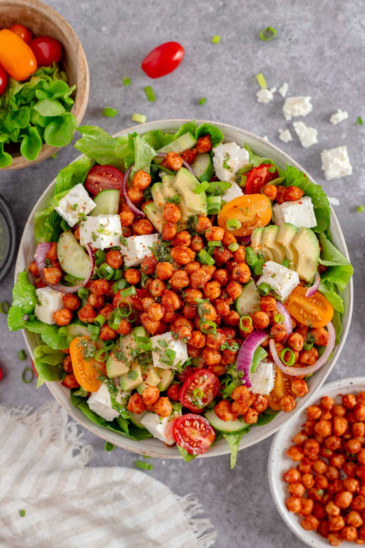 - Assemble the salad. Combine chickpeas and all the remaining salad ingredients in one large bowl and drizzle the dressing right before ready to serve. Top with feta and freshly cut avocado on top. (Avocado will brown quick, while cutting it drizzle plenty of lime or lemon juice on top).