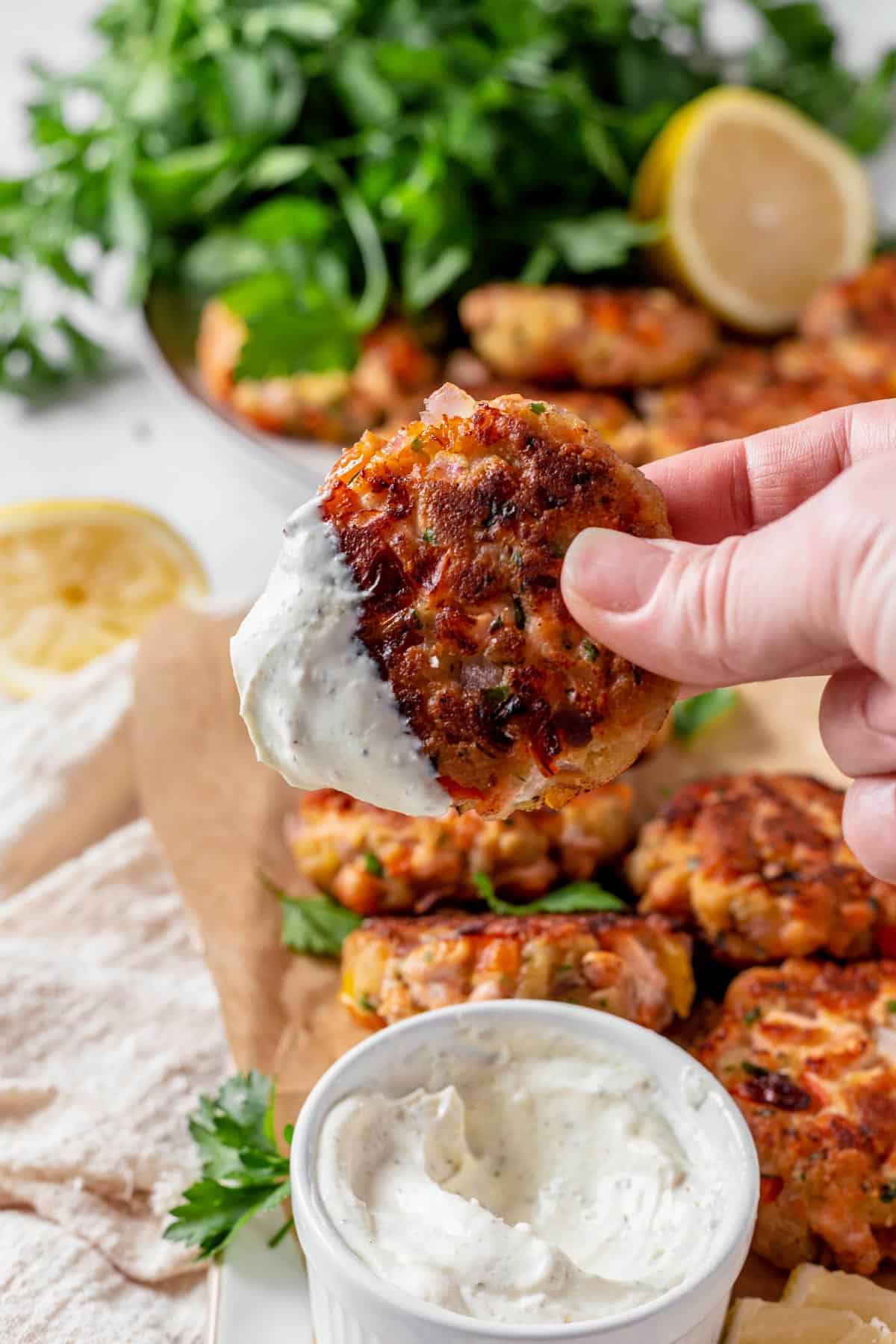 Hi! How did you make the dipping sauce? There's no recipie for the dipping sauce here. I tried a couple from the internet in the past and they were not that good, so I am a bit confused as to what would be a good dipping sauce for salmon patties. I like the salmon patties I I make them good, my recipie is very similar to this one, but no luck on the sauce yet. I will try a tahini based one next, maybe that one will be better!