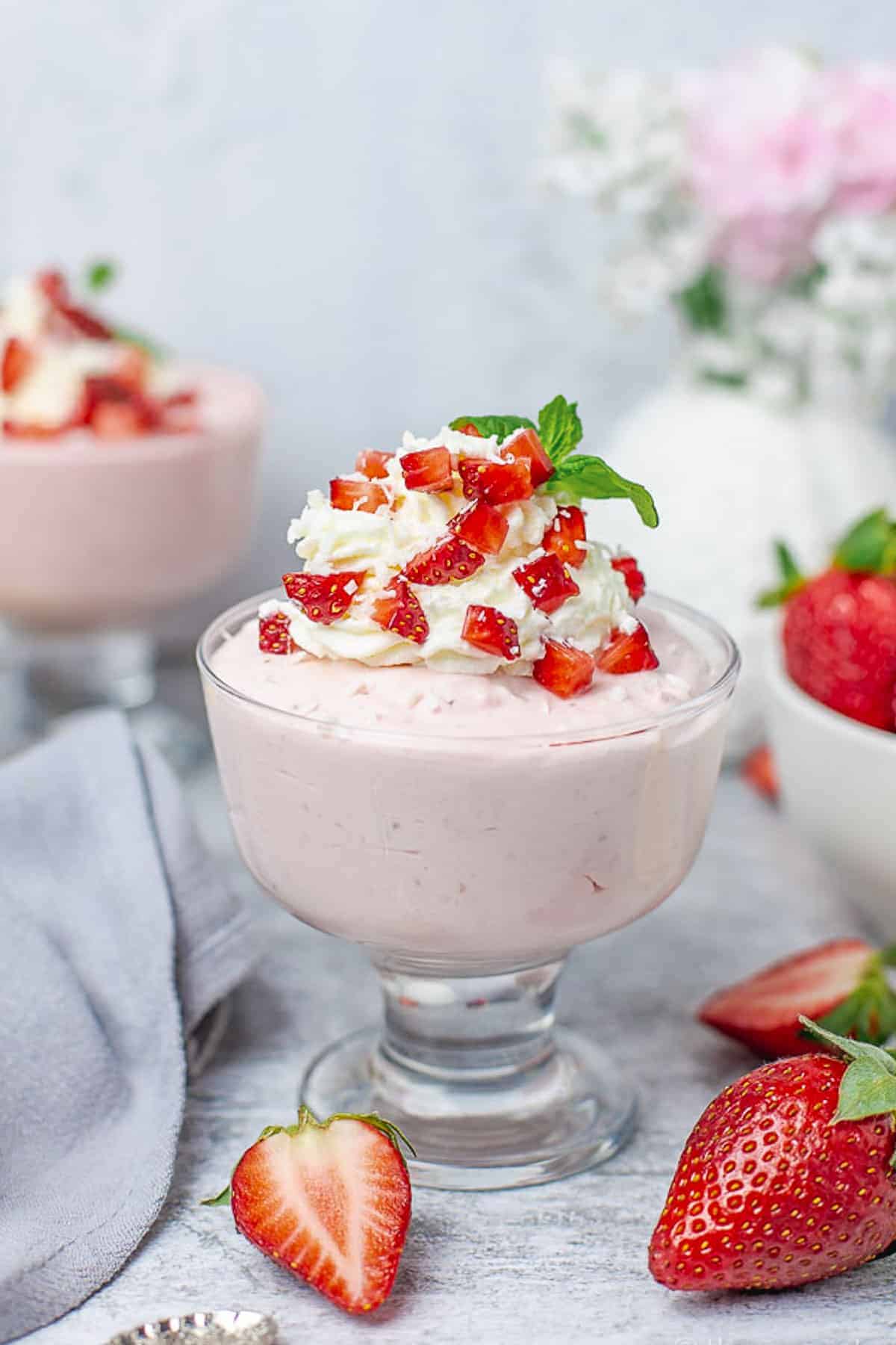 Spoon the strawberry mousse into serving glasses and refrigerate for at least 2-4 hours or keep checking until you see the desired firmer texture (Ideally overnight).