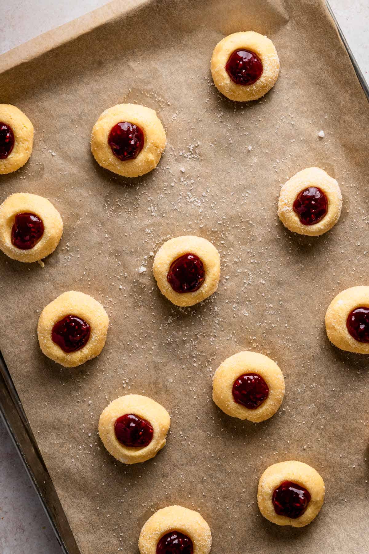 - Don't overfill - don't add too much of the raspberry jam into each indentation. This will make cookies spread more and the flavor will become too sweet.