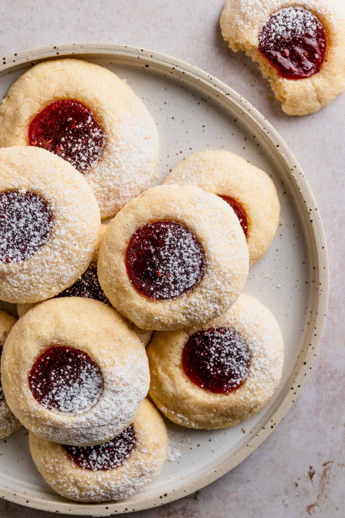 Raspberry thumbprint cookies are soft cookies that will remind you of a buttery shortbread filled with tangy raspberry jam. You can make these with regular or gluten-free flour blend and both versions are incredibly flavorful. These cookies just melt in your mouth!