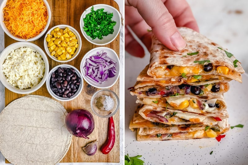 These Mexican Quesadillas are loaded with black beans, sweet corn, and two kinds of gooey melted cheese. Soft tortillas are then lightly toasted on a skillet until crisp. You'll love this recipe as they make a great hearty lunch or easy dinner in just under 30 minutes.