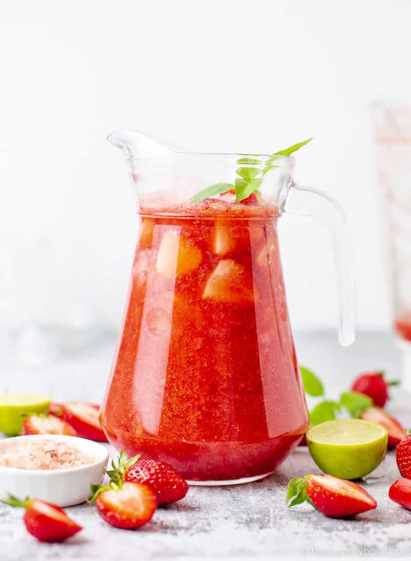 - Pour mixture into a jar, pitcher, or individual cups filled with ice, garnish with fresh chili, strawberries, mint, or basil leaves (optional).