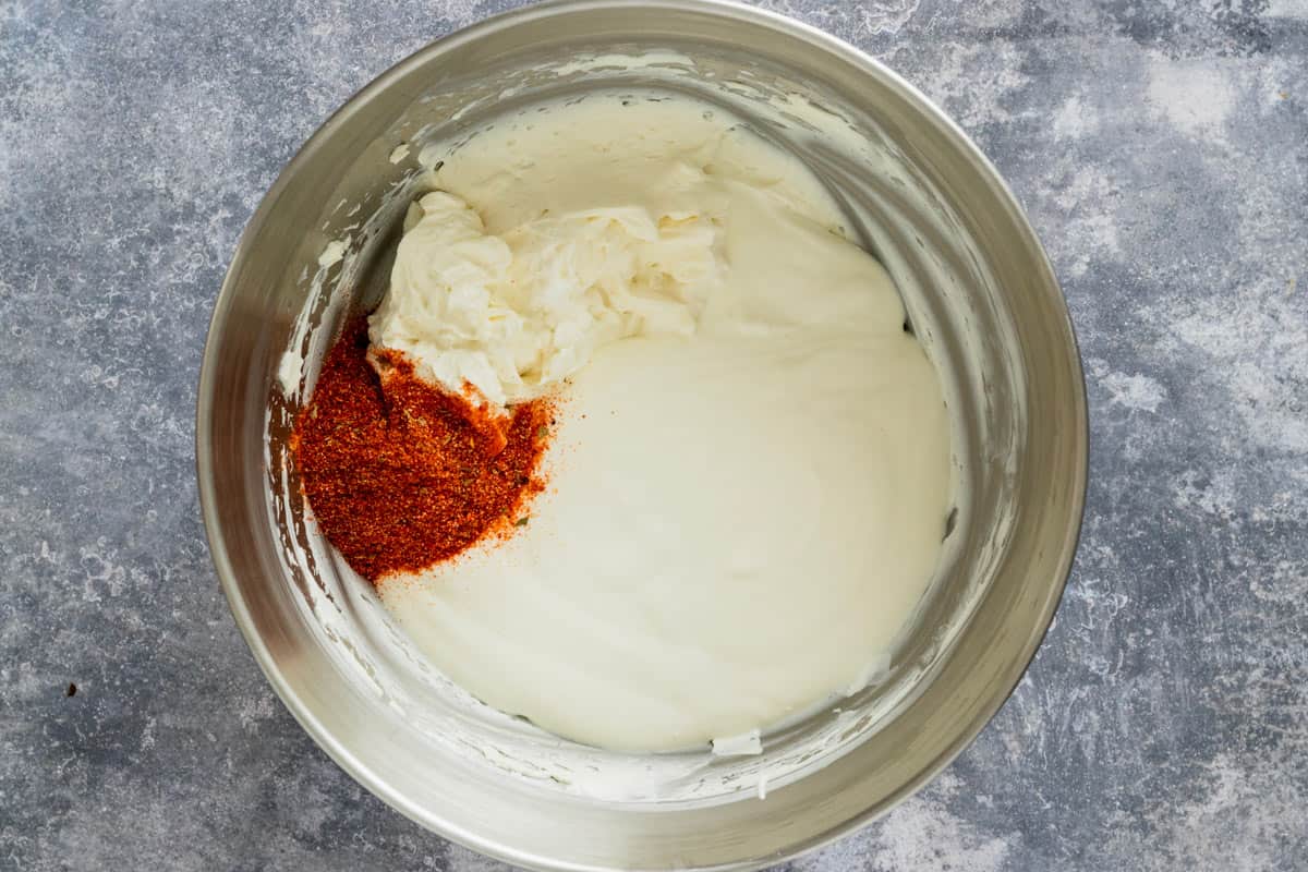 - With an electric mixer on medium, beat together cream cheese, sour cream, and taco seasoning.