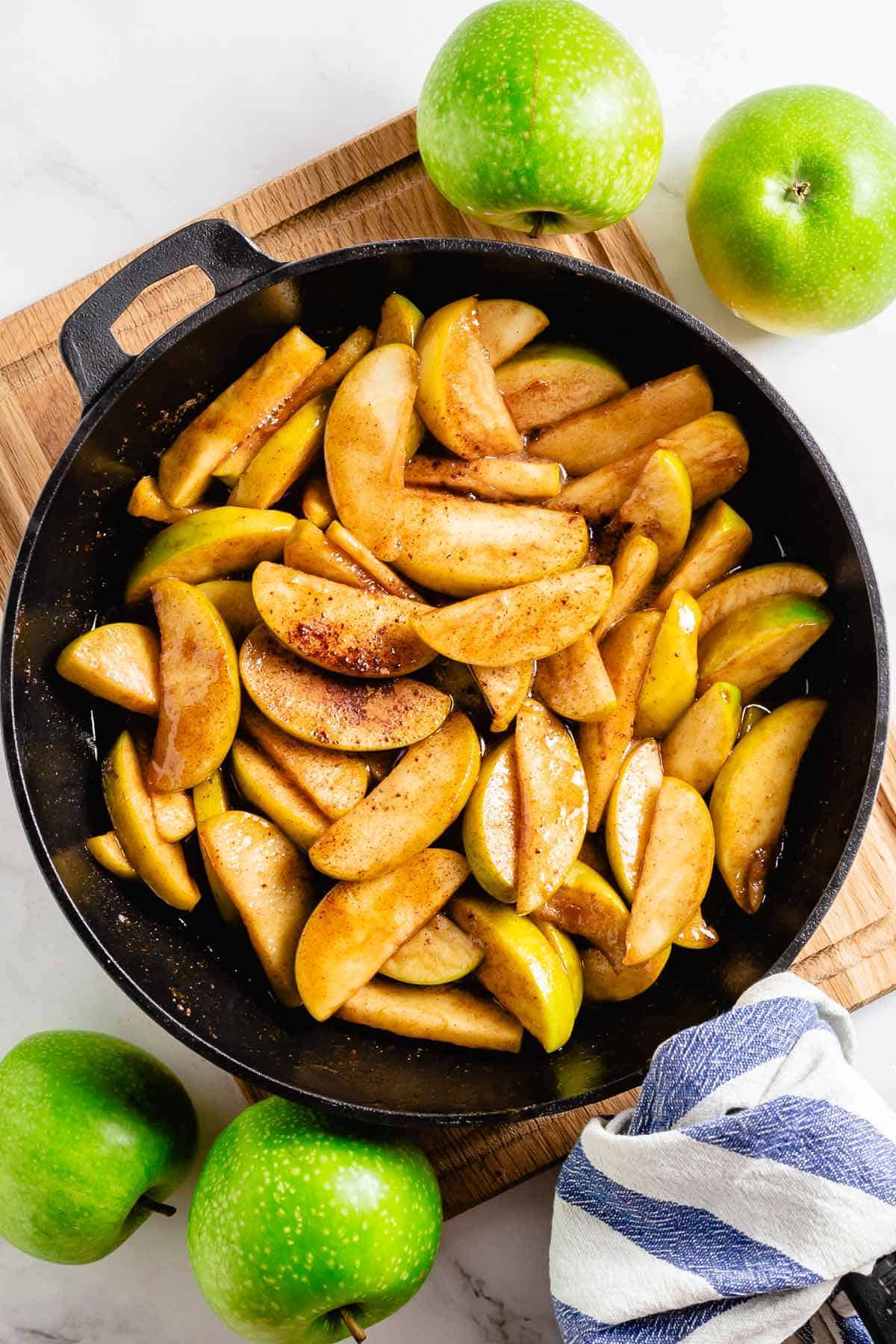 - Don’t overcrowd the skillet - this fried apples with cinnamon recipe is enough for one crumble pie about 8,9 or 10-inch baking dish (you may even have some leftovers!). If you want to make some extra or need it in double amount avoid overcrowding the skillet and cook in batches.