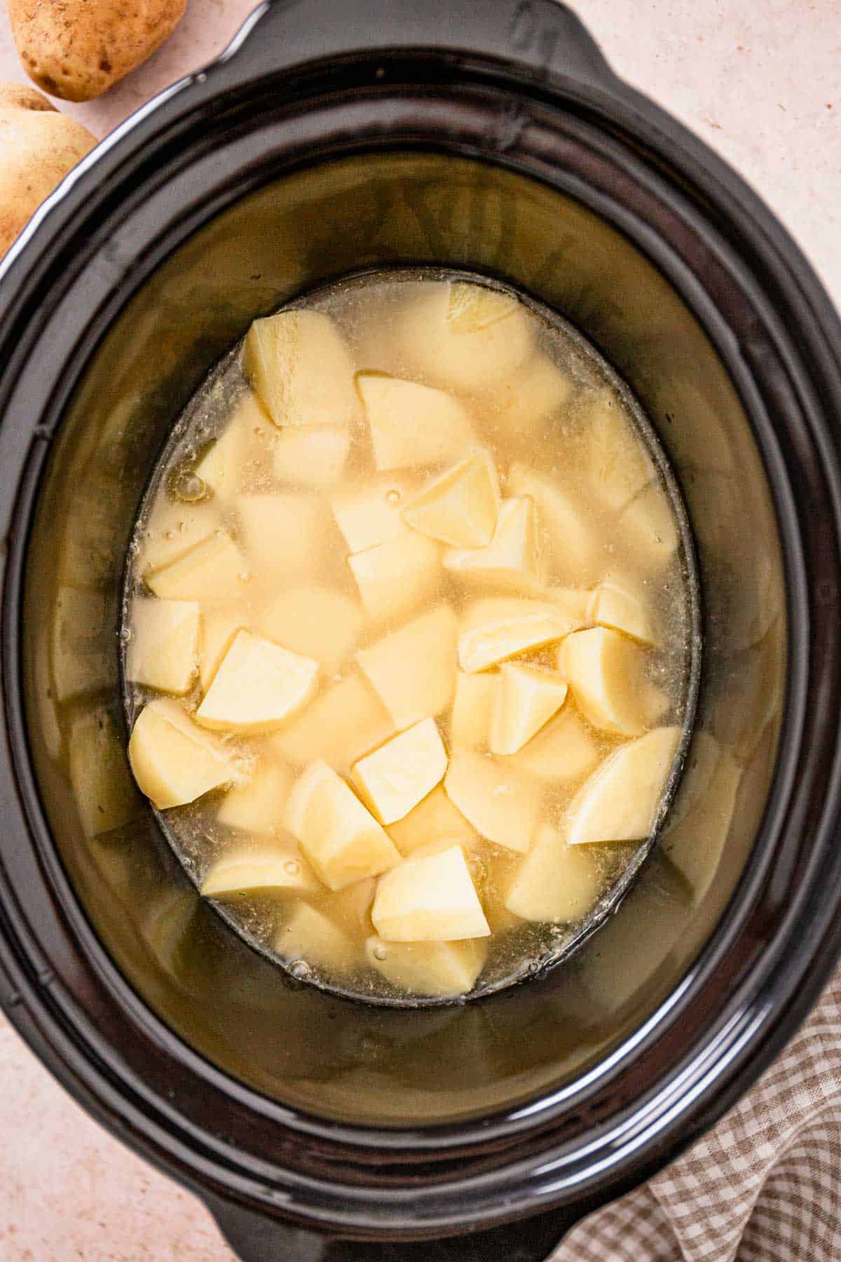 - Add the potatoes and broth to a smaller about 4.5-quart slow cooker.